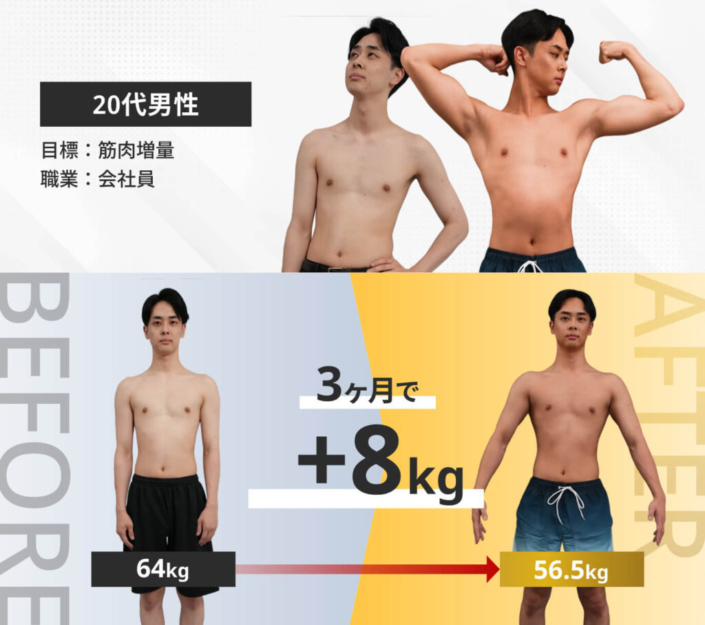 効果の出方は個々によりますが、一般的には3ヶ月程度で目に見える変化が現れます。それまでの間、 継続的なトレーニングと適切な食事管理を続けるようにしましょう!
