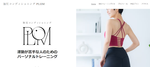 | 加圧コンディショニングPLOM | 加圧トレーニングを活用・女性限定のパーソナルトレーニング | 5,000円 | しっかりコース 40分 月8回×2ヶ月 64,000円 | 加圧コンディショニングPLOM |