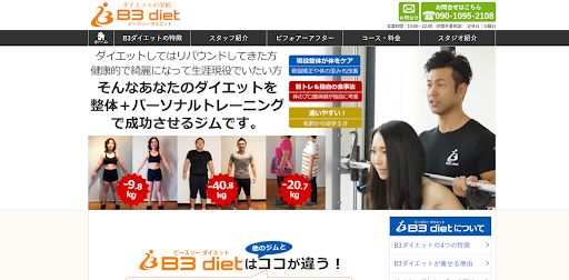 | B3 diet 安城スタジオ | 土日祝日も営業・骨盤矯正や整体を受けながらトレーニング可能 | 33,000円 | 2ヶ月集中トレーニング 60分 16回 193,413円 | B3 diet 安城スタジオ |