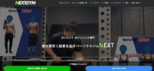| NEXTGYM 東大阪店 | 完全個室で理想のボディメイク、リバウンドしにくい体づくりを地域最安値で実現 | 10,000円(現在先着様限定) | 50分 月8回×2ヶ月 79,600円 | NEXTGYM 東大阪店 |