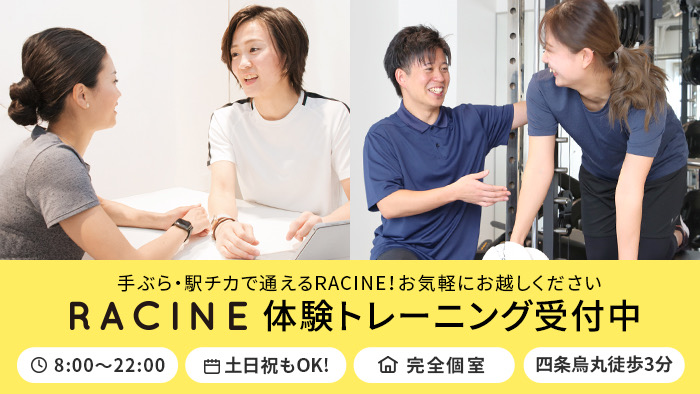 | RACINE(ラシーヌ)京都四条烏丸 | 一人ひとりに合わせた完全オーダーメイドのトレーニング | 0円 (2026年3月31日まで) | 生活習慣改善30日プログラム:49,500 月2回コース:19,800 スタンダードコース 8回:82,500〜 12回:123,750〜 16回:165,000~ 20回:206,250〜 24回:247,500〜 32回:330,000〜 | RACINE(ラシーヌ)京都四条烏丸 |