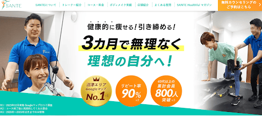 | SANTE | 医療資格保有パーソナルトレーナーと管理栄養士の完全個室指導あり | 22,000円(当日入会で無料) | 50分8回×2ヶ月 123,200円 | SANTE |