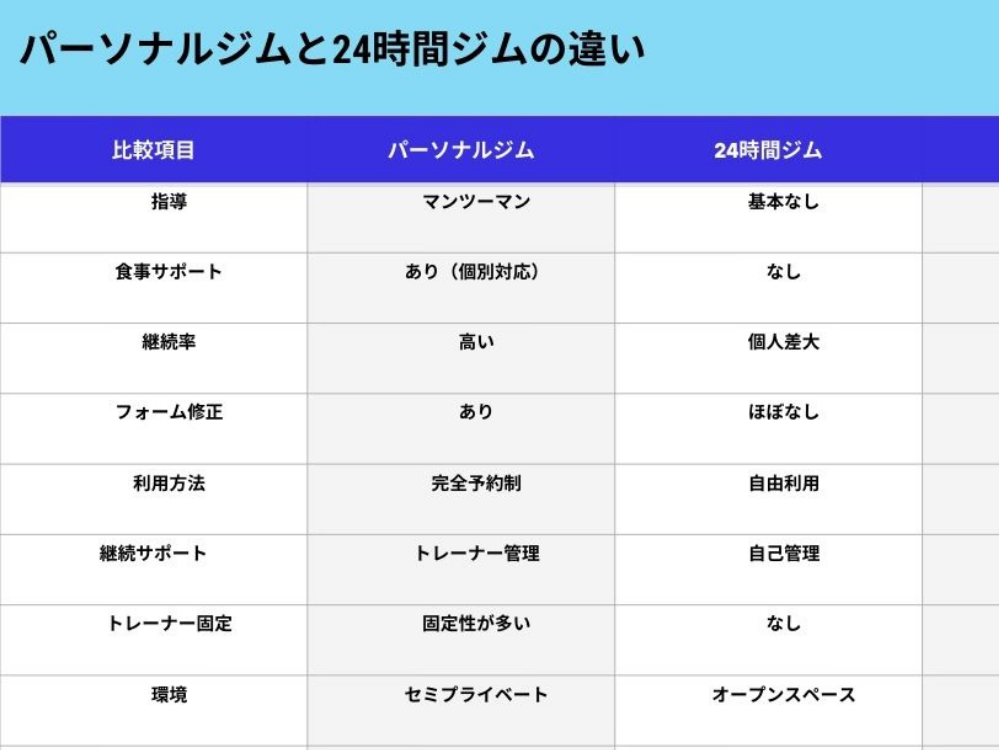 以下、パーソナルジムと24時間ジムの比較表を作成してみました♪