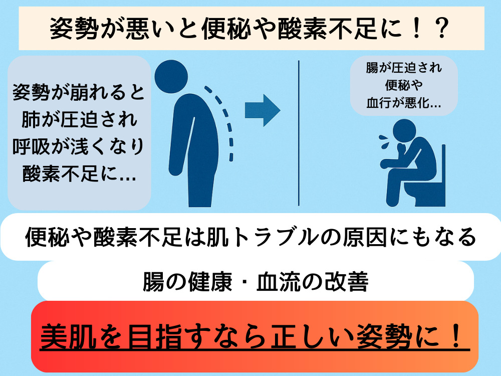 その筋肉が弱いと、どうしても体が前に倒れ、呼吸が浅くなり、肌へ届く酸素も不足してしまいます。