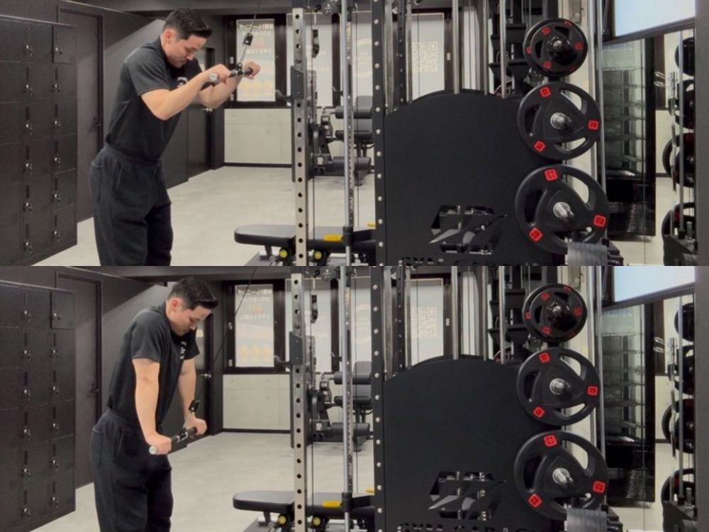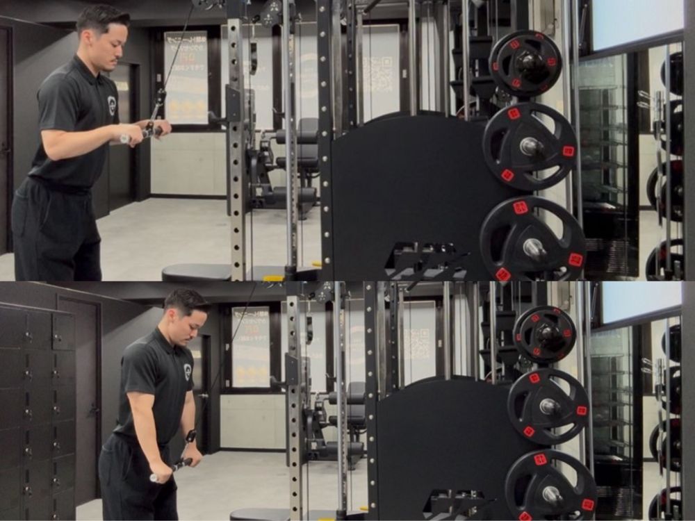 ✅ケーブルマシンにロープまたはストレートバーをセットし、肘を体の横に固定してスタート✨