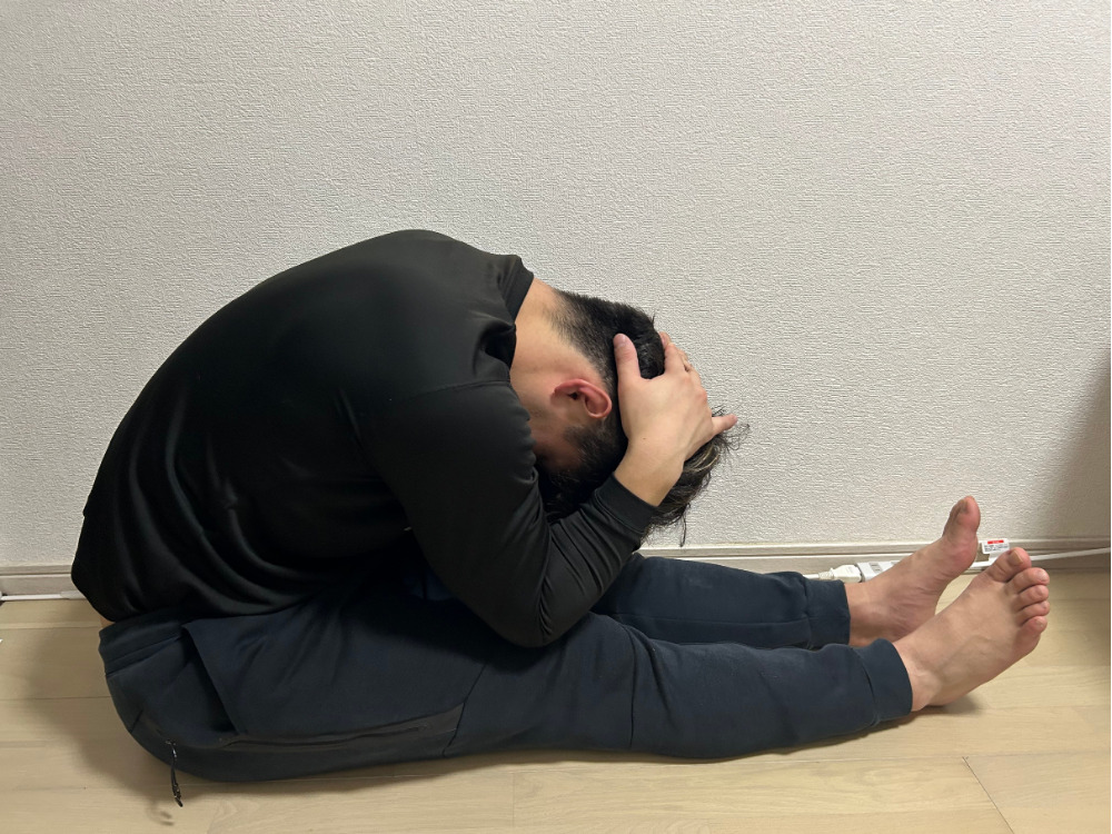 手を頭の裏で組んで肘を膝に付けるように前屈します!