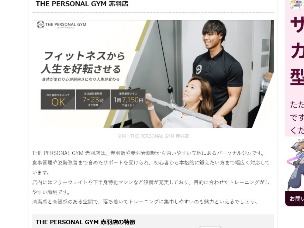 その中で、THE PERSONAL GYM赤羽店については、赤羽駅や赤羽岩淵駅から通いやすい立地にあるパーソナルジムとしてご紹介いただきました。
