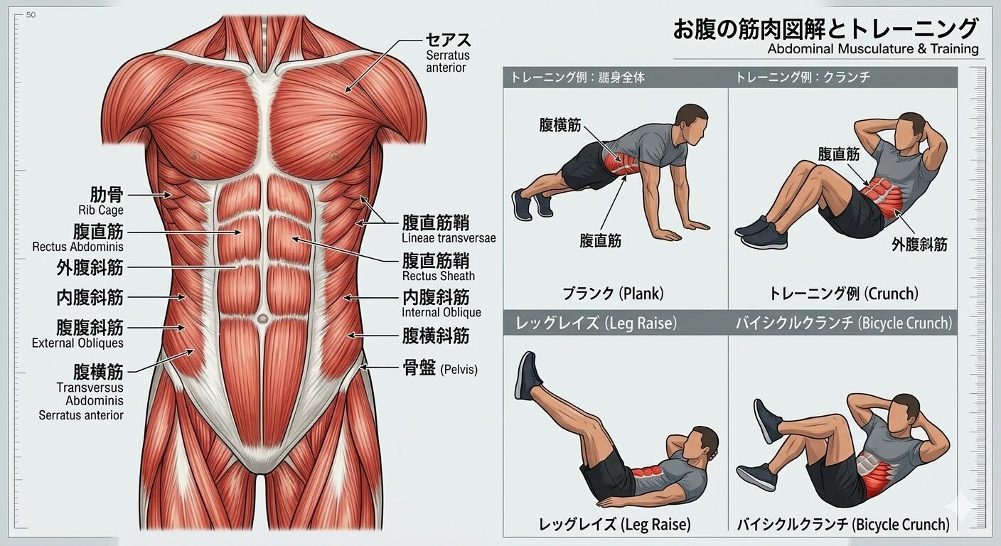 下腹部は腹直筋下部+腸腰筋、脇腹は腹斜筋が担当