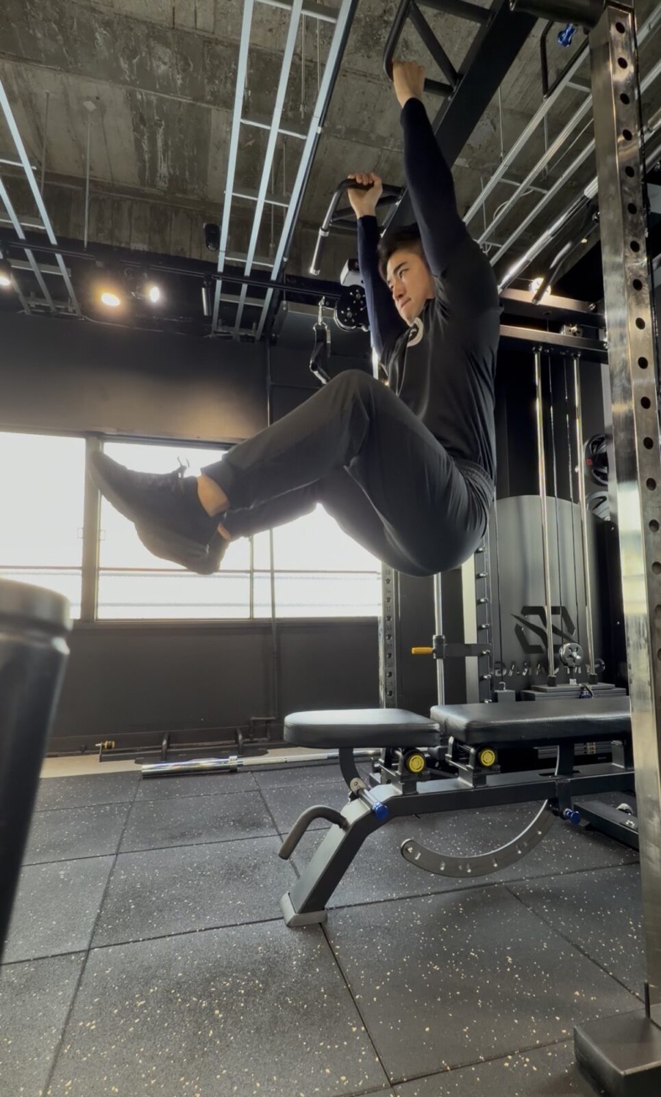 フォームのコツ:膝を肩に向かって引き寄せ、雑巾を絞るように腹斜筋を締める