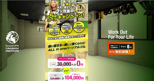 | FUNABASHI INSTITUTE | 姿勢や動きのクセを分析し、機能改善とボディメイクを同時に行うパーソナルジム。落ち着いた雰囲気で、運動が苦手な女性や運動初心者でも安心して相談できる環境。 | 30,000円 | スタンダードコース 60分×8回 77,000円(税込)のプランあり(週1×2ヶ月のイメージ)。 | FUNABASHI INSTITUTE |