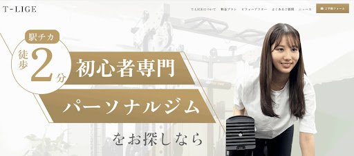 | T-LIGE | 「初心者専門」を掲げるパーソナルジム。フォーム指導や食事アドバイスも丁寧で、運動経験ゼロから本格ダイエットに挑戦したい女性や運動初心者に向く。 | 33,000円 | 60分×16回(週2×2ヶ月)148,000円 | T-LIGE |