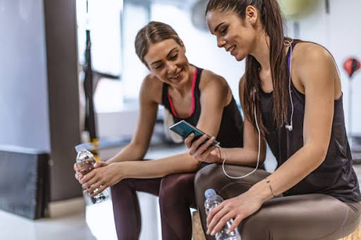 Two attractive sportswomen in the gym sitting down and reading text messages