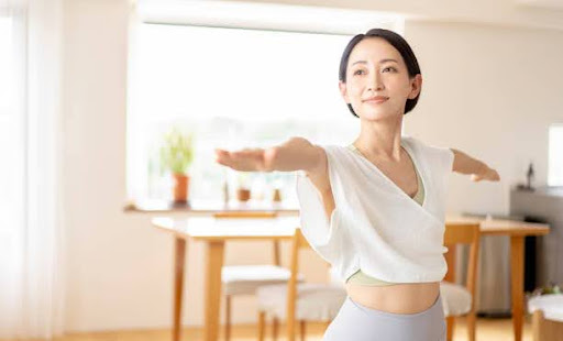 A Japanese woman practices yoga in the living room. She is in a warrior pose.