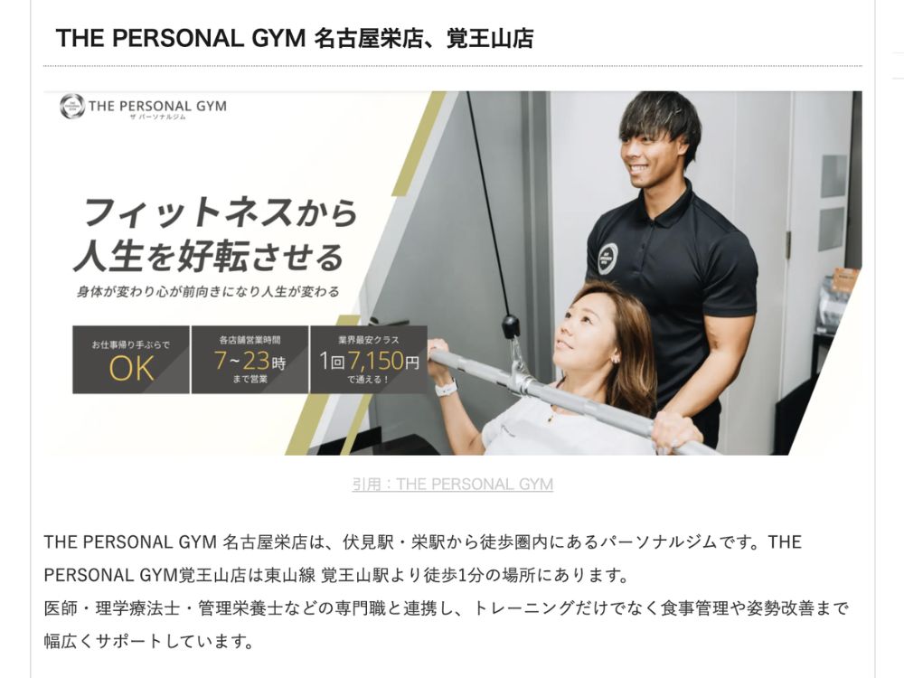 KASHI KARI(カシカリ) 様の「【名古屋】おすすめスポーツジム10選!人気の店舗を厳選紹介【口コミ付】」にて、THE PERSONAL GYM 名古屋栄店をご紹介いただきました!
