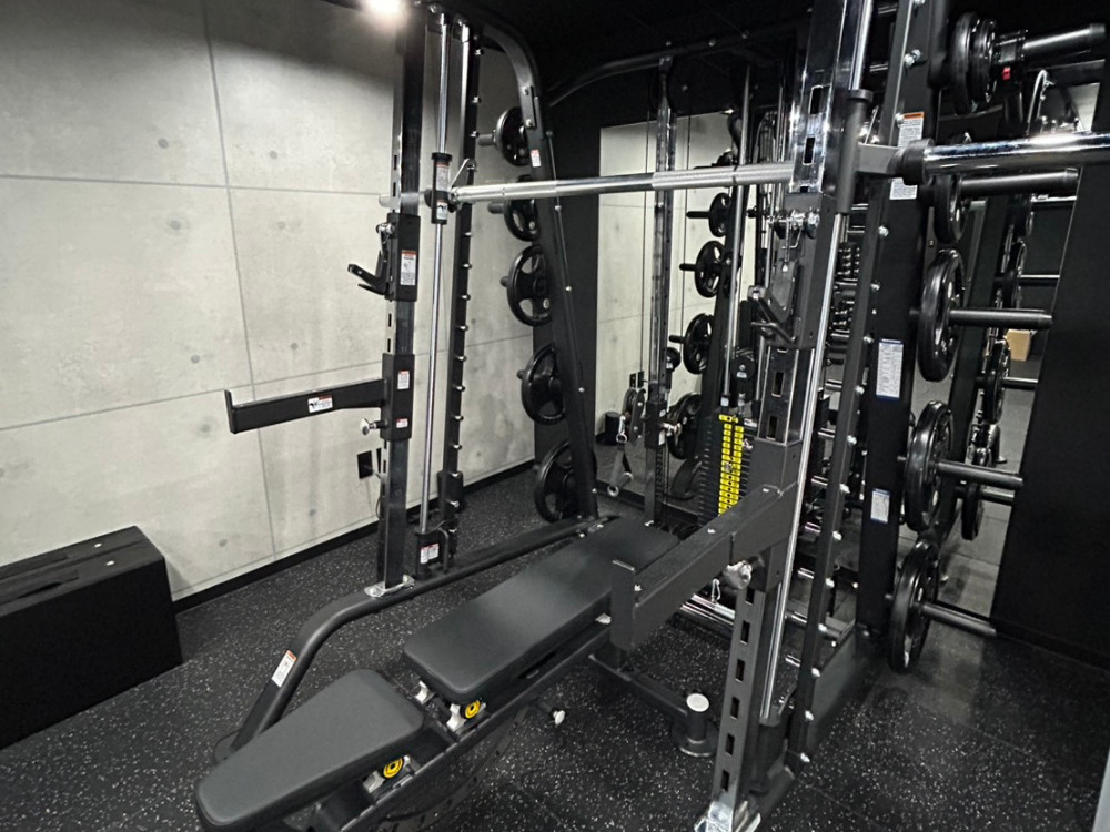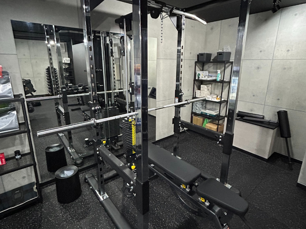 当店に設置されたスミスマシンは、安全にフリーウェイトトレーニングを行うことができる万能マシンです!