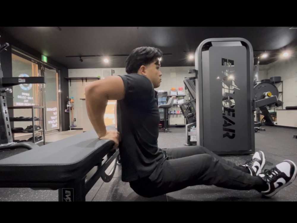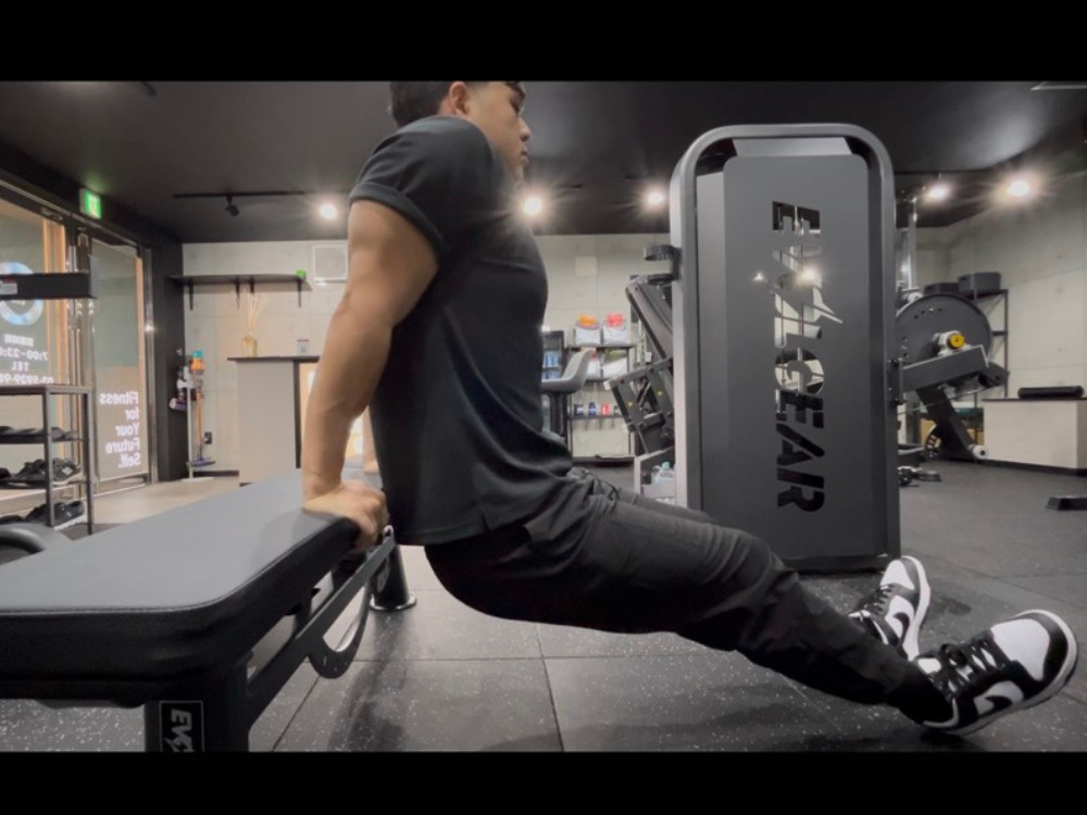 脚をもう1つのベンチやステップに乗せると負荷が上がり、より三頭筋に効かせられます!
