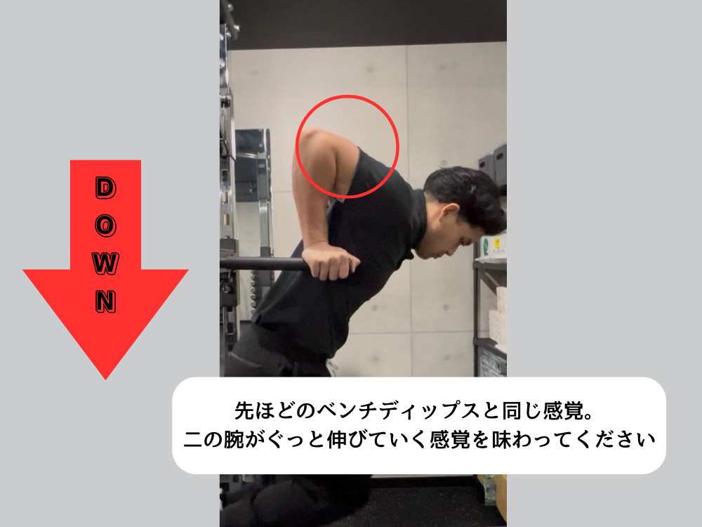 この動作を丁寧にできるようになると、腕の裏側に「ギュッ」とした強烈な収縮が入るようになり、