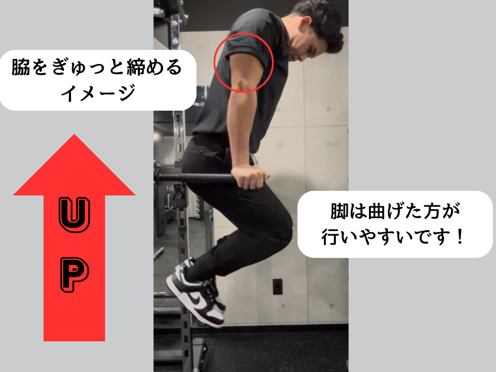 ディップスの上昇局面では、ただ体を持ち上げるのではなく、“脇を締めて三頭筋を縮めていく”という意識が重要になります。