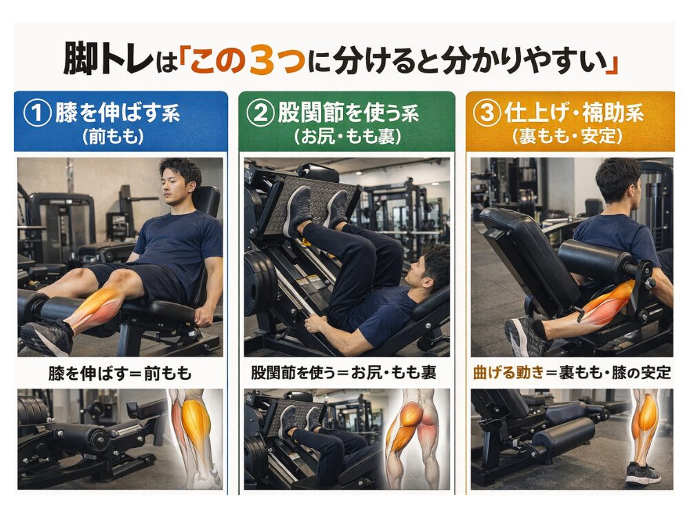 脚トレは「膝を伸ばす」「股関節を使う」「仕上げ・補助」の3つに分けて考えるだけで、何をやるべきかが一気に整理できます。