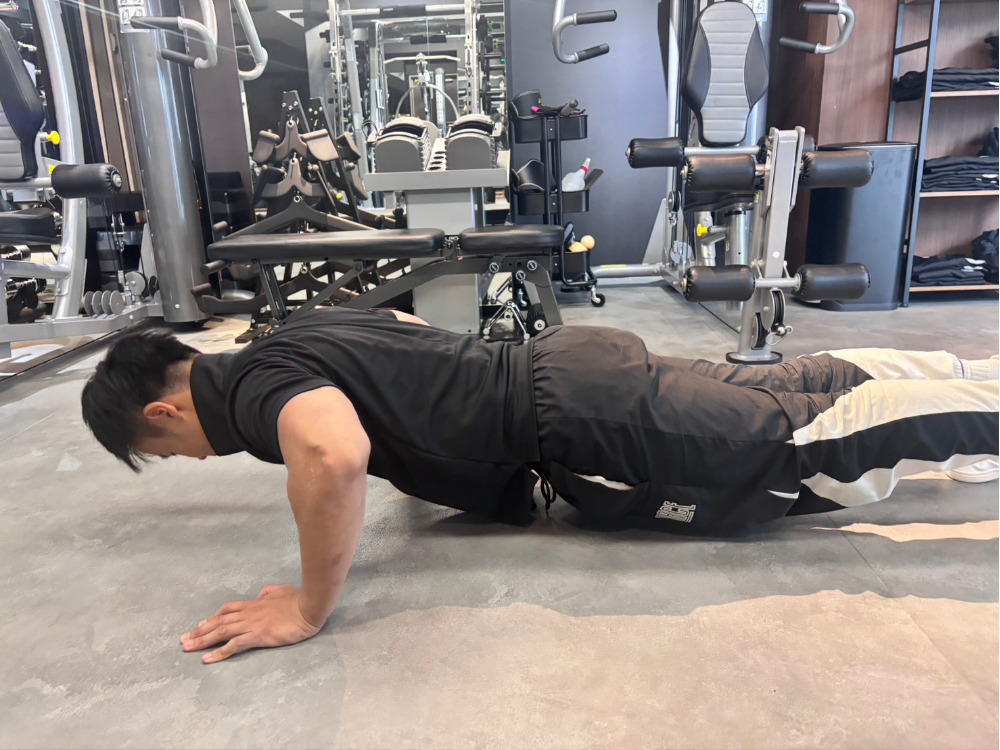 胸が床に近づかないと、大胸筋がしっかり伸びず、筋肉に刺激が入りません。