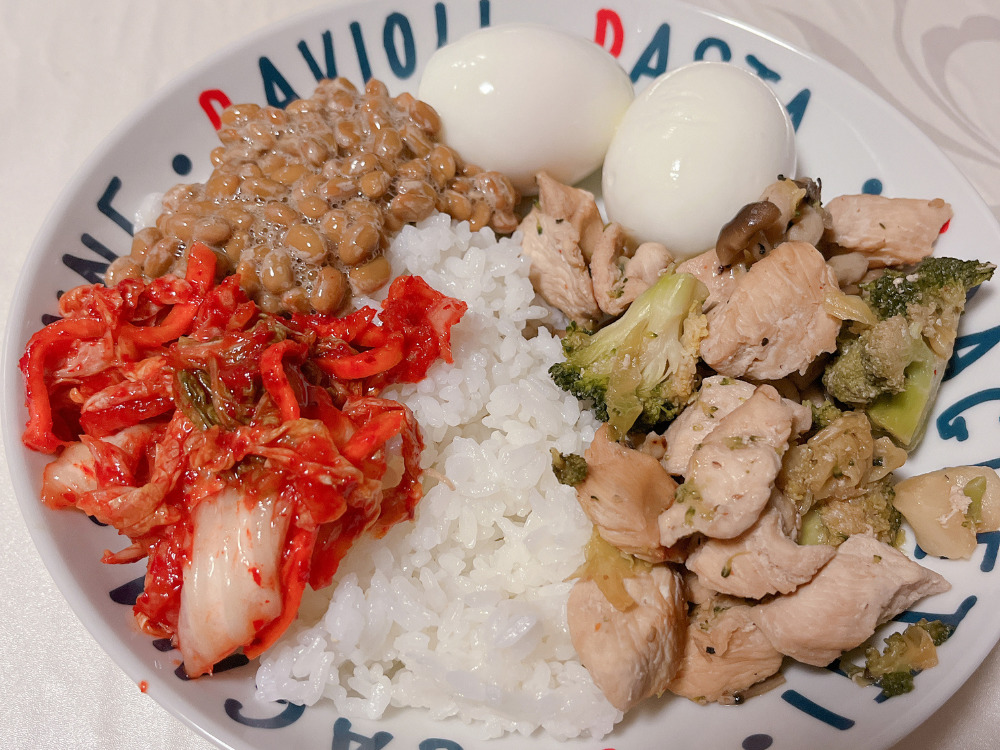 白米(炭水化物)胸肉(たんぱく質)卵(たんぱく質・脂質)納豆(たんぱく質・脂質)