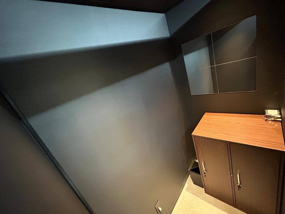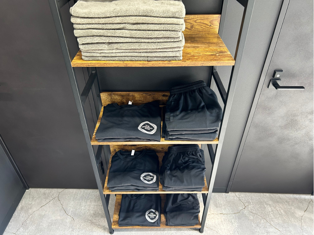 更衣室も黒を基調としたお部屋になっております。制汗剤シートもご用意しておりますのでトレーニング後も安心。更衣室は皆様のトレーニングに対しての気持ち高めてくれる最後の場所です。