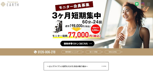 Personal gym EARTH長町店45分・60分・80分の3プランから選べて、月2回から無理なく始めやすい、完全個室型のパーソナルジム22,000円。